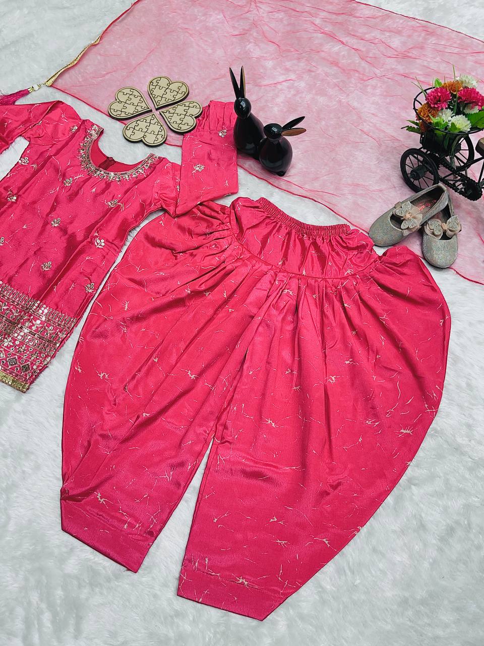 A timeless beauty in deep navy blue — this Patiala suit is designed for the little diva who loves grace with a touch of glam. Featuring delicate golden motifs, ruffled sleeves, and a statement embroidered border, the outfit pairs perfectly with pleated Patiala pants and a matching dupatta. Perfect for festive gatherings, family occasions, or traditional celebrations!