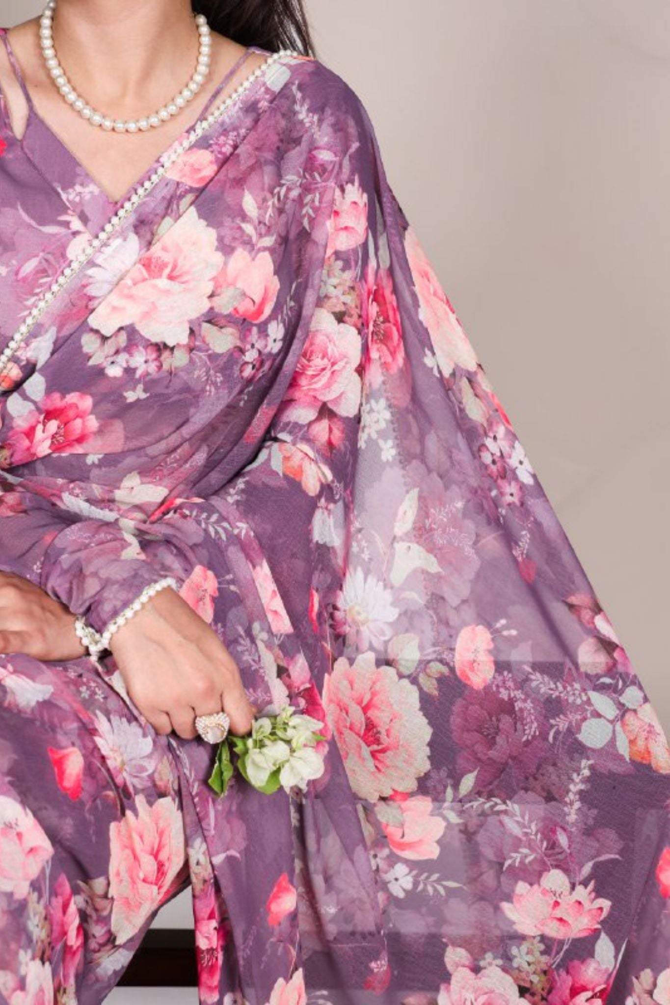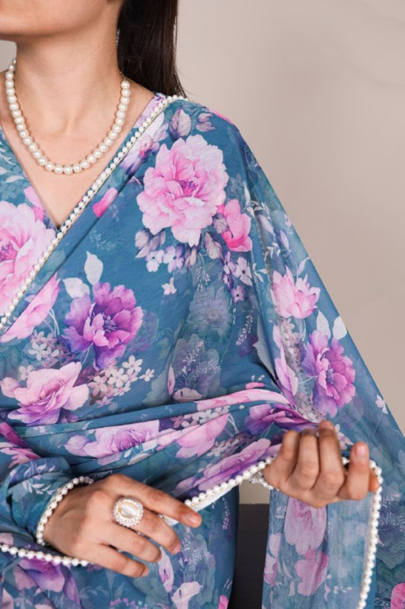 Elegant Pearl Lace Detailing Floral Printed Saree
