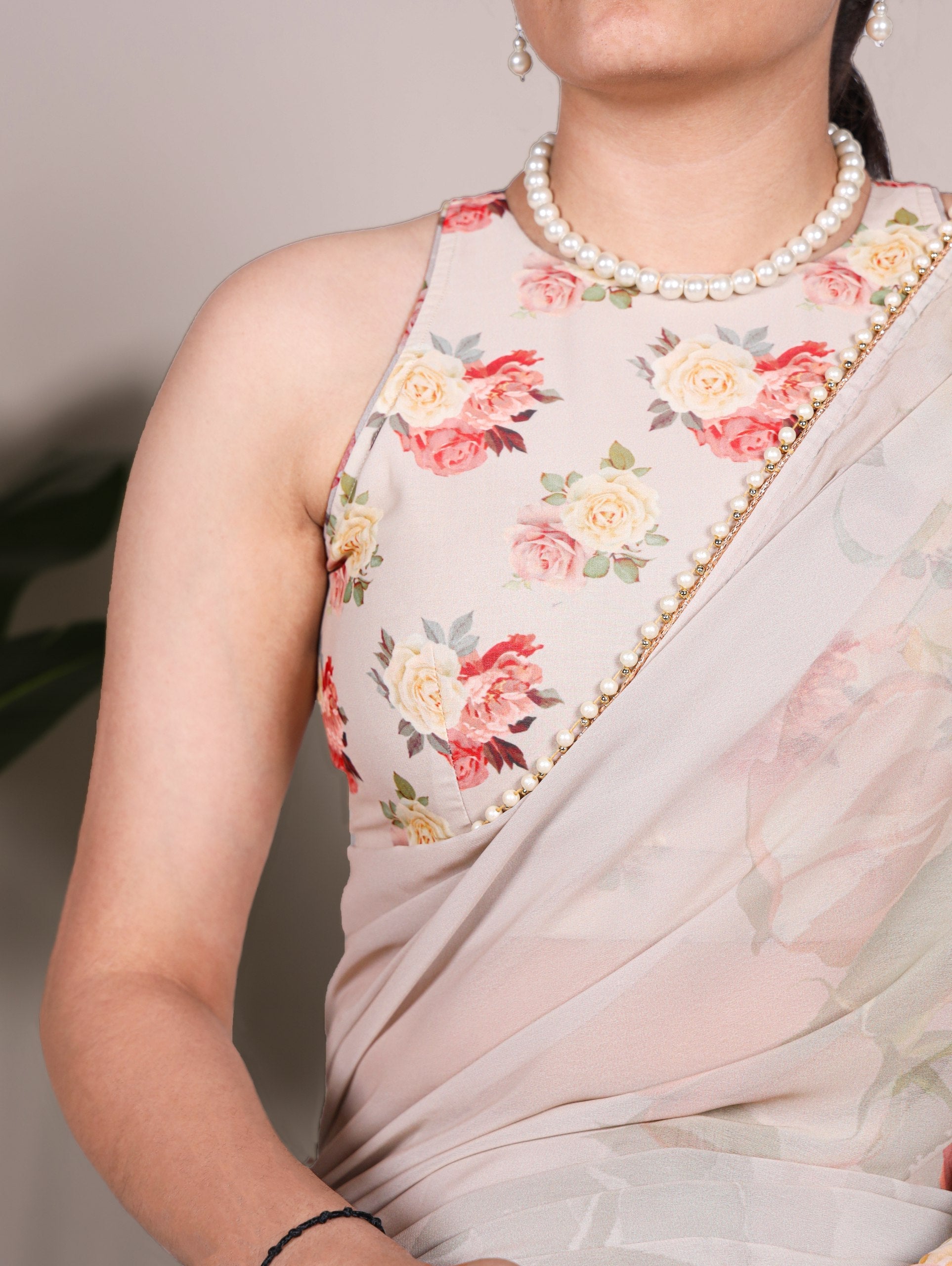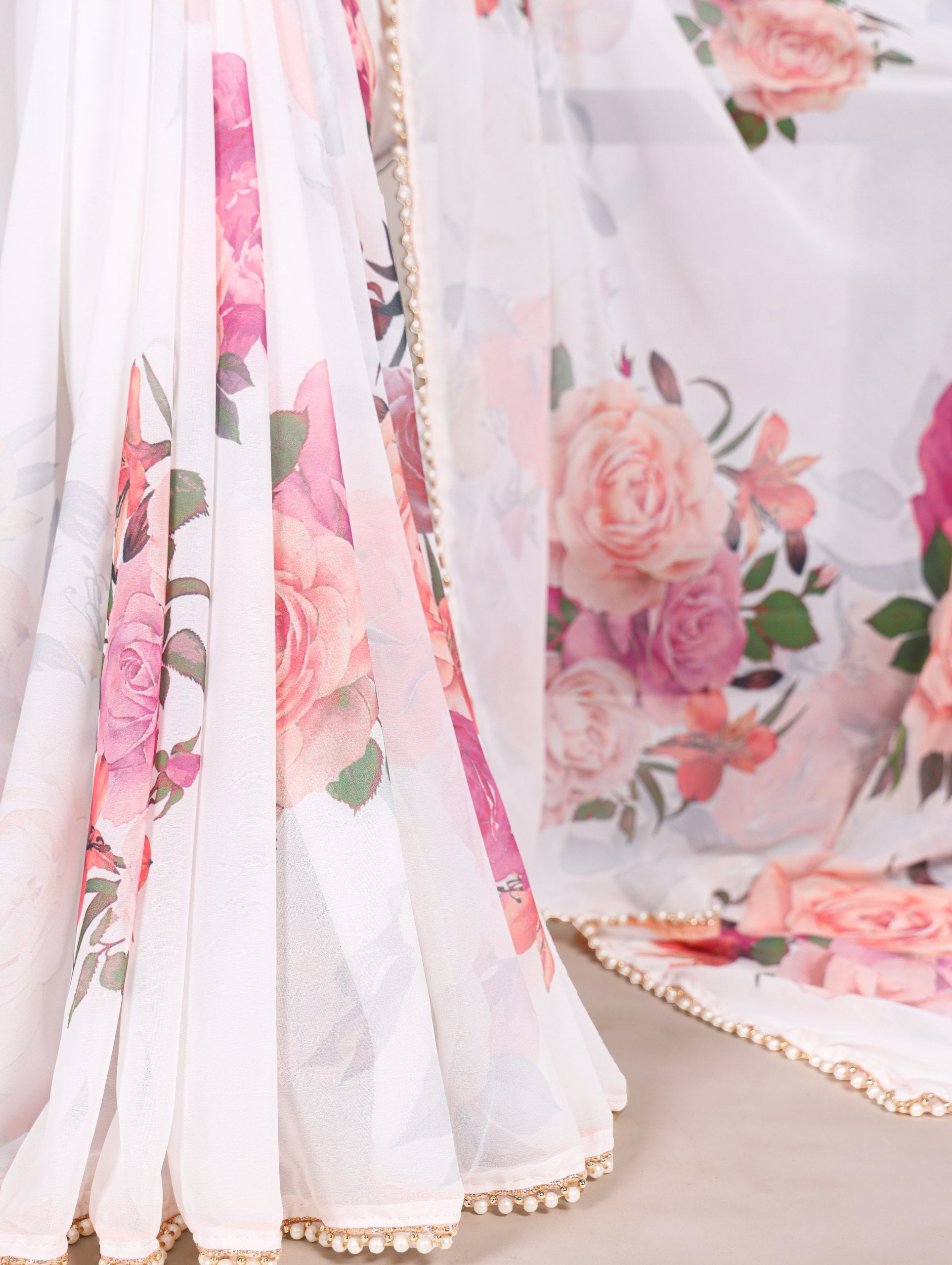 Multicolor Rose Print Georgette Saree with Pearl Lace Border